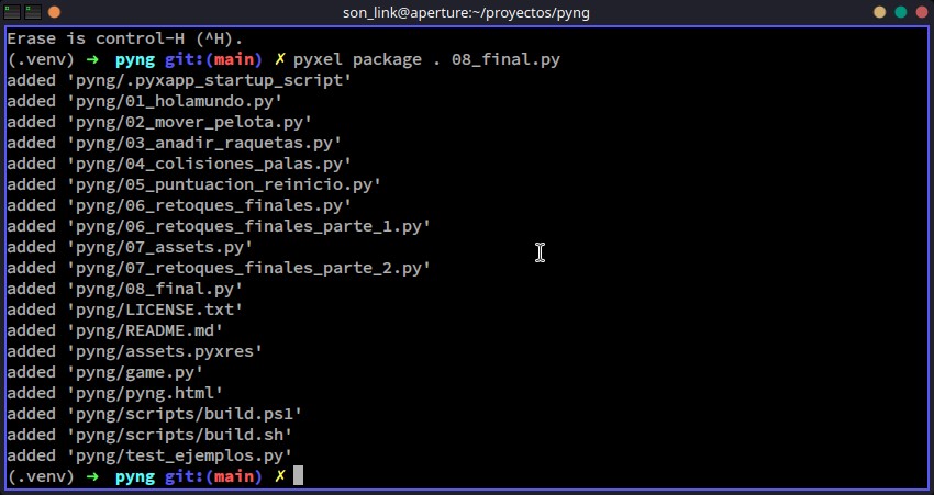 Para probarlo, simplemente hacemos doble clic sobre el ejecutable, o desde la terminal ./pyng, o .\pyng.exe en Windows. Sí todo salio bien, ya puedes distribuir el juego, siendo lo idóneo crear para ello un paquete .zip, si bien para GNU/Linux lo ideal es crear un tar.xz