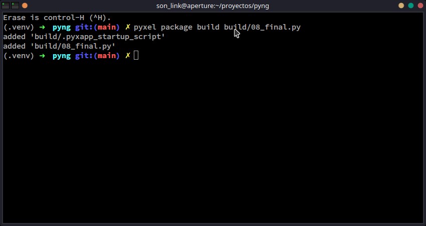 Ahora vamos a renombrar el paquete generado, build.pyxapp, a pyng.pyxapp. Esto lo hacemos así por qué Pyxel generara una carpeta con el nombre del archivo, y nos avisara de que se sobrescribiran los datos en la carpeta build